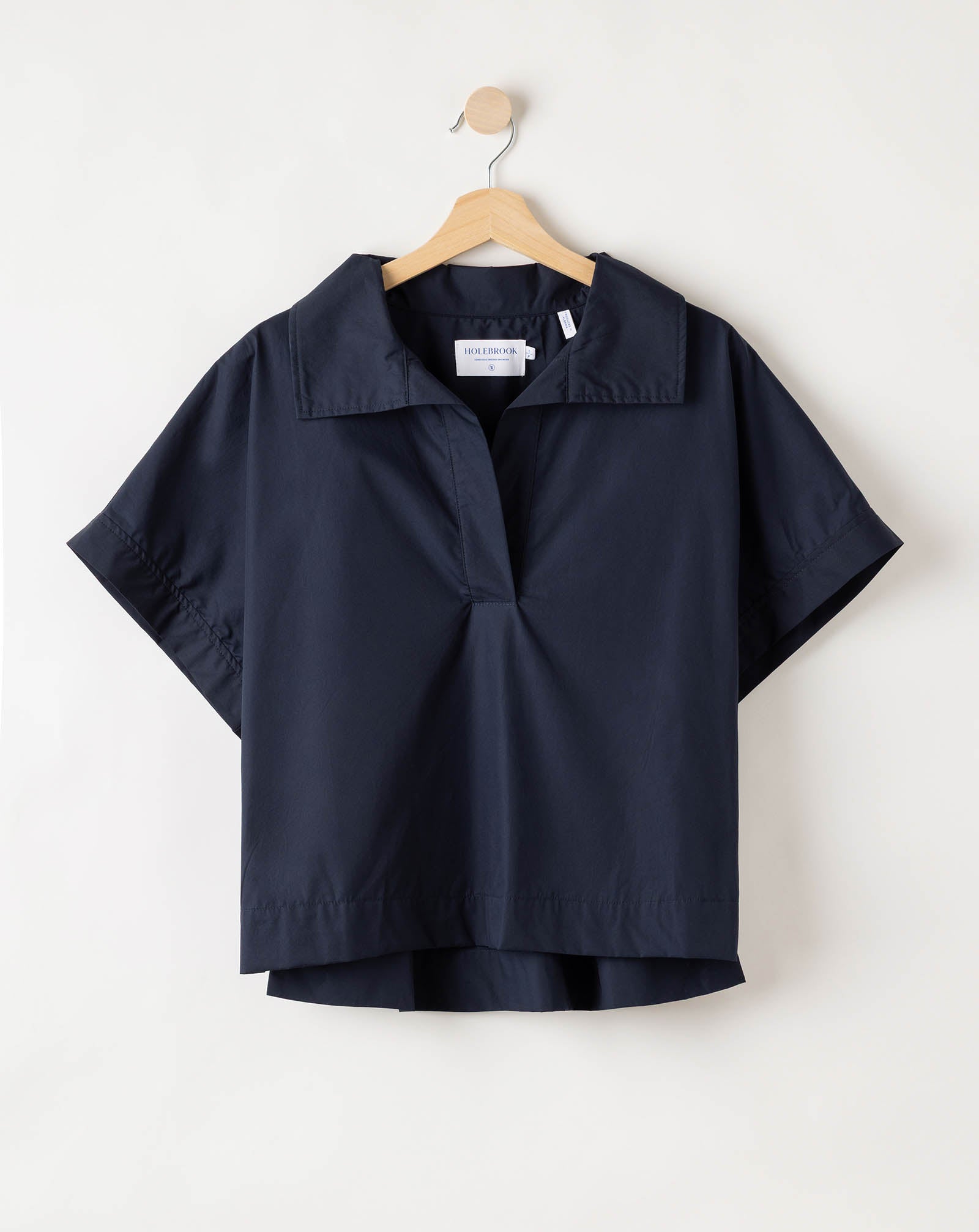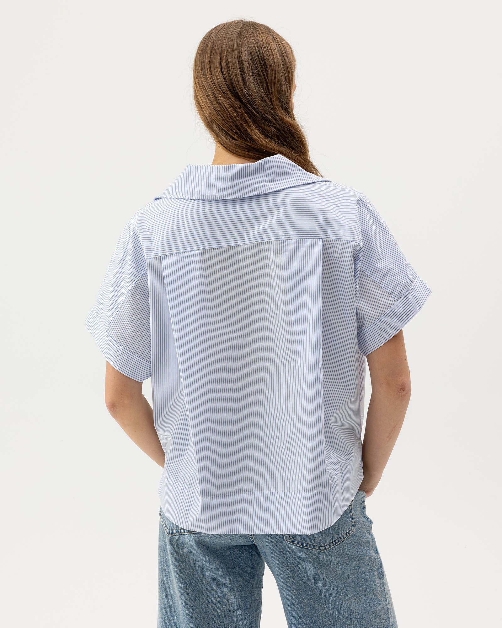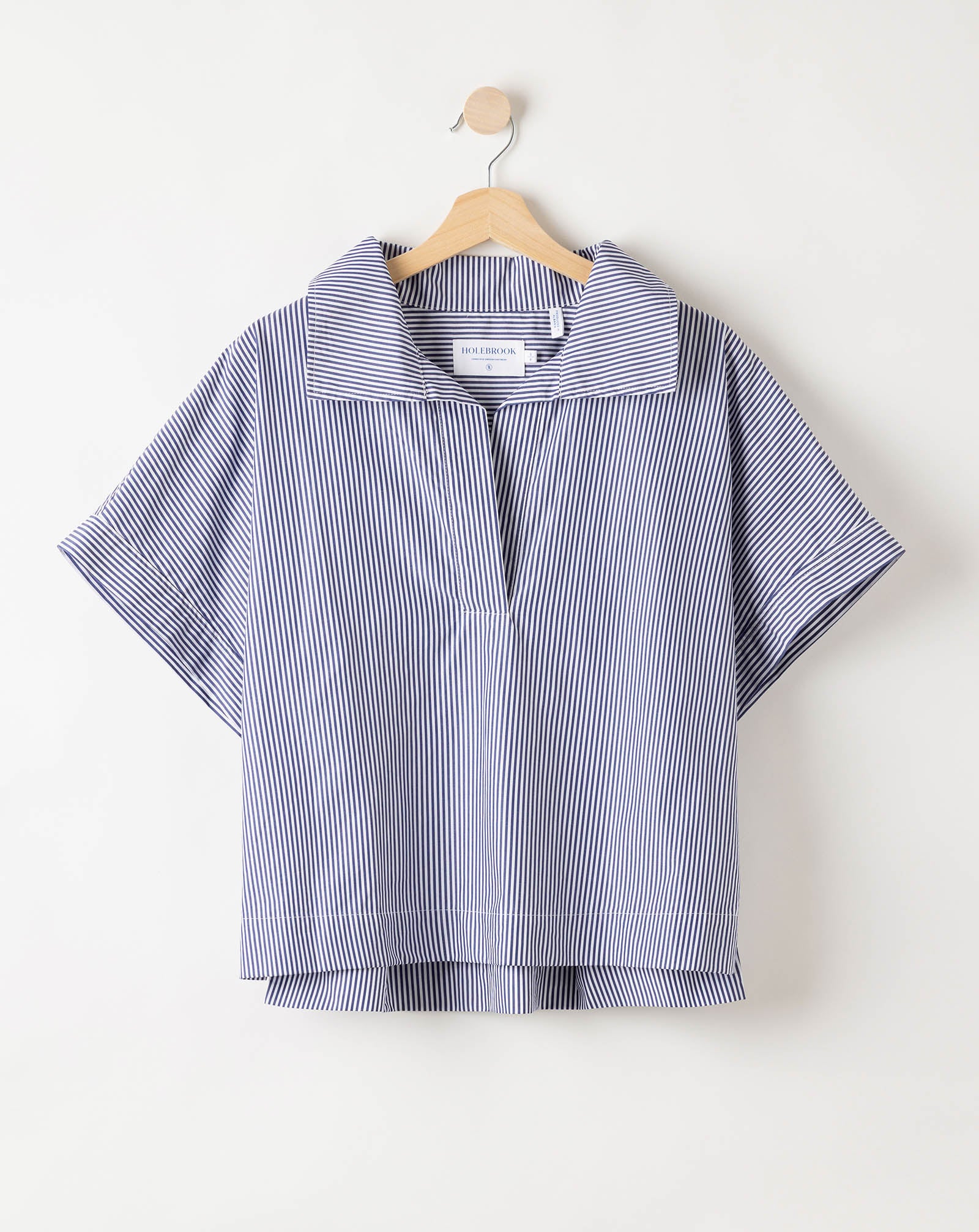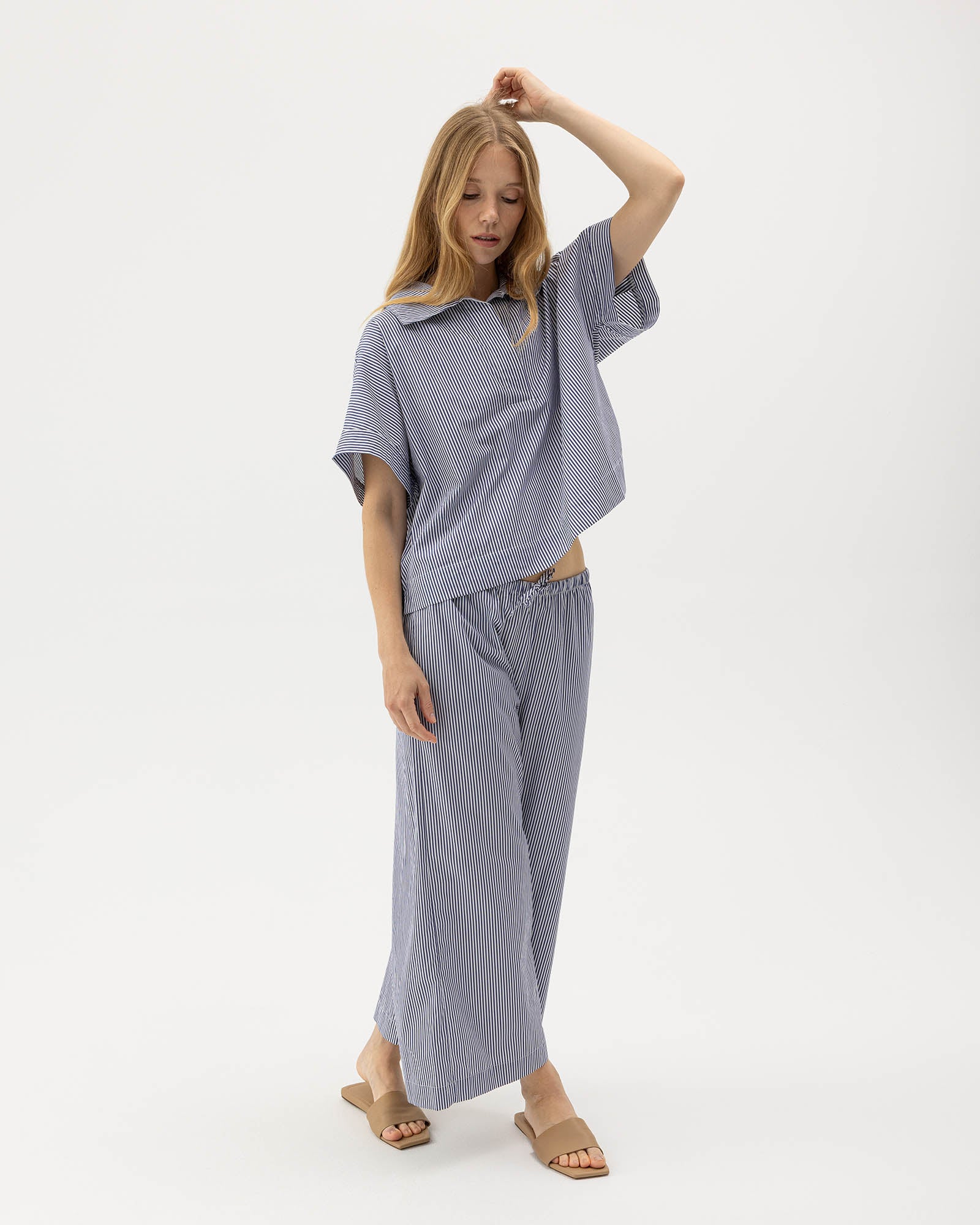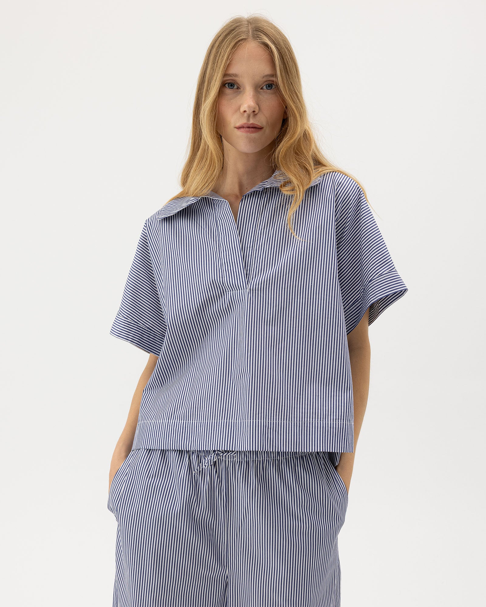 A pop-over shirt with a relaxed, contemporary silhouette. Designed with a wide open collar, dropped shoulders, and short sleeves for an effortless drape. The clean front placket and straight hem create a modern, understated look. Style with the matching bottoms for a cohesive, Scandinavian-inspired set. Designed in Sweden and produced in Europe. 100% high quality cotton poplin.